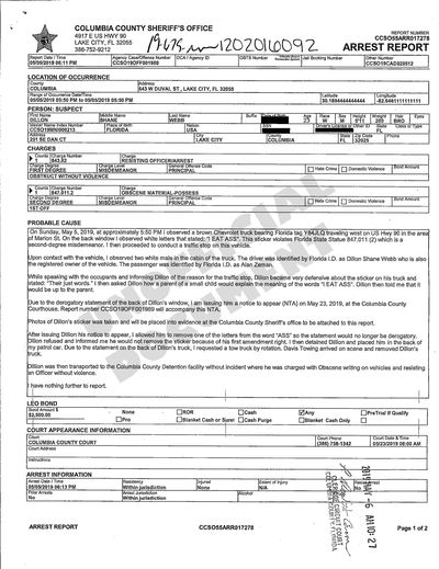 Dillon Shane Webb, 23, was arrested on Cinco de Mayo 2019 when he refused to remove letters from his bumper sticker reading "I EAT ASS." The arrest was all recorded from the policeman's dash cam. The cops, perhaps hypocritically, say they want to "tow his shit."